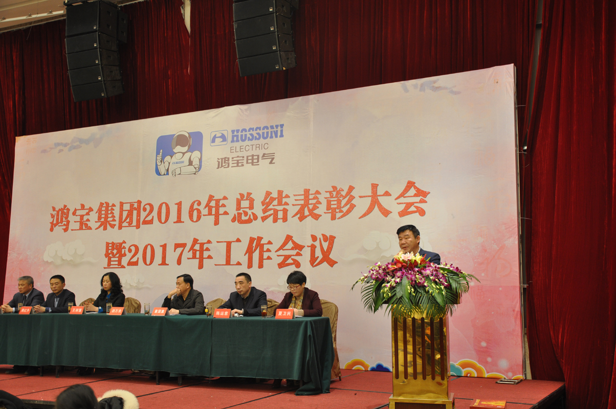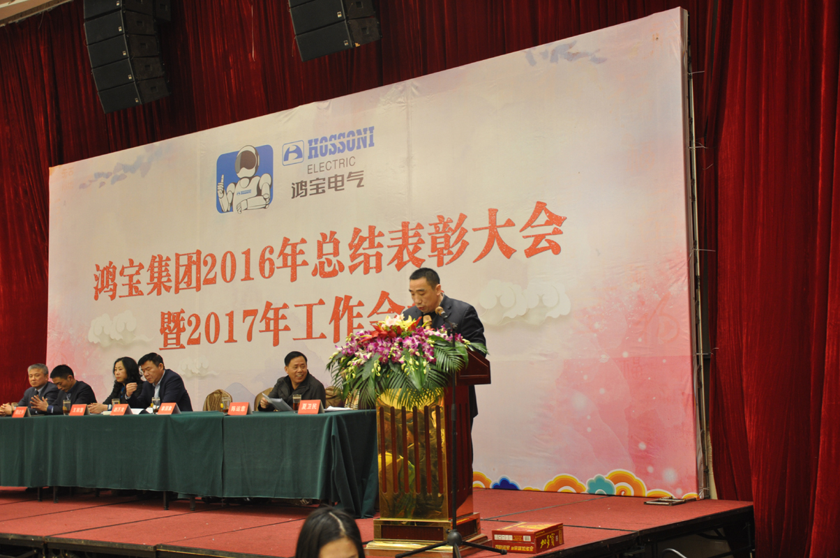 1月15日下午,鴻寶電氣集團(tuán)在柳市新新雅假日大酒店貴賓樓A\B廳隆重召開2016年度總結(jié)表彰大會暨2017年工作會議。出席本次會議的領(lǐng)導(dǎo)有公司董事長、總經(jīng)理、副總經(jīng)理、監(jiān)事長、各部門主管及公司員工300余人參加會議。會議由辦公室主任夏為民主持,會議在莊嚴(yán)神圣的國歌聲中拉開了序幕,公司監(jiān)事長王麗慧為大會致詞,生產(chǎn)副總經(jīng)理周紅升宣讀了表彰文件,公司隆重表彰了10位優(yōu)秀員工,銷售部陳蓮蓮和黨員鄭永忠代表優(yōu)秀員工和優(yōu)秀黨員做了發(fā)言,技術(shù)副總經(jīng)理陳運意就如何提升產(chǎn)品質(zhì)量做了詳細(xì)的質(zhì)量報告,總經(jīng)理章國象認(rèn)真客觀地總結(jié)了公司2016年的工作取得的成績和榮譽,并提出了2017年工作目標(biāo)和計劃。會議上董事長胡萬良分別與生產(chǎn)副總經(jīng)理周紅升、技術(shù)副總經(jīng)理陳運意和銷售代表陳蓮蓮分別簽訂了安全生產(chǎn)管理協(xié)議、質(zhì)量管理協(xié)議和銷售考核協(xié)議。最后董事長胡萬良作了重要講話,他對集團(tuán)公司2016年的工作做了具體的評價,并指出2016年,我們面對世界經(jīng)濟疲軟,國內(nèi)外市場復(fù)雜嚴(yán)峻等不利因素,全體員工團(tuán)結(jié)一致,不斷進(jìn)取,逆勢而上,保持了企業(yè)平穩(wěn)發(fā)展。同時,胡董提出:在新的一年, 全體員工要做到不因成績而驕傲,不因挫折而氣餒,我們要有同一個信念,目標(biāo)一致,做到有目標(biāo)、有計劃、有實施、有檢查、有監(jiān)督、有結(jié)果,他對大會提出了七點意見和要求,他指出全體員工要以百折不撓的精神從團(tuán)隊合作、提高生產(chǎn)效率、狠抓產(chǎn)品質(zhì)量、全力開拓新市場等方面要求員工堅定信心,團(tuán)結(jié)一致,攻堅克難,再創(chuàng)鴻寶新的輝煌。